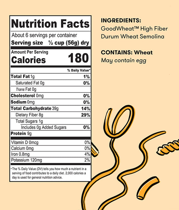 *Contains 8g of fiber per serving compared to 2g of fiber in regular wheat pasta.