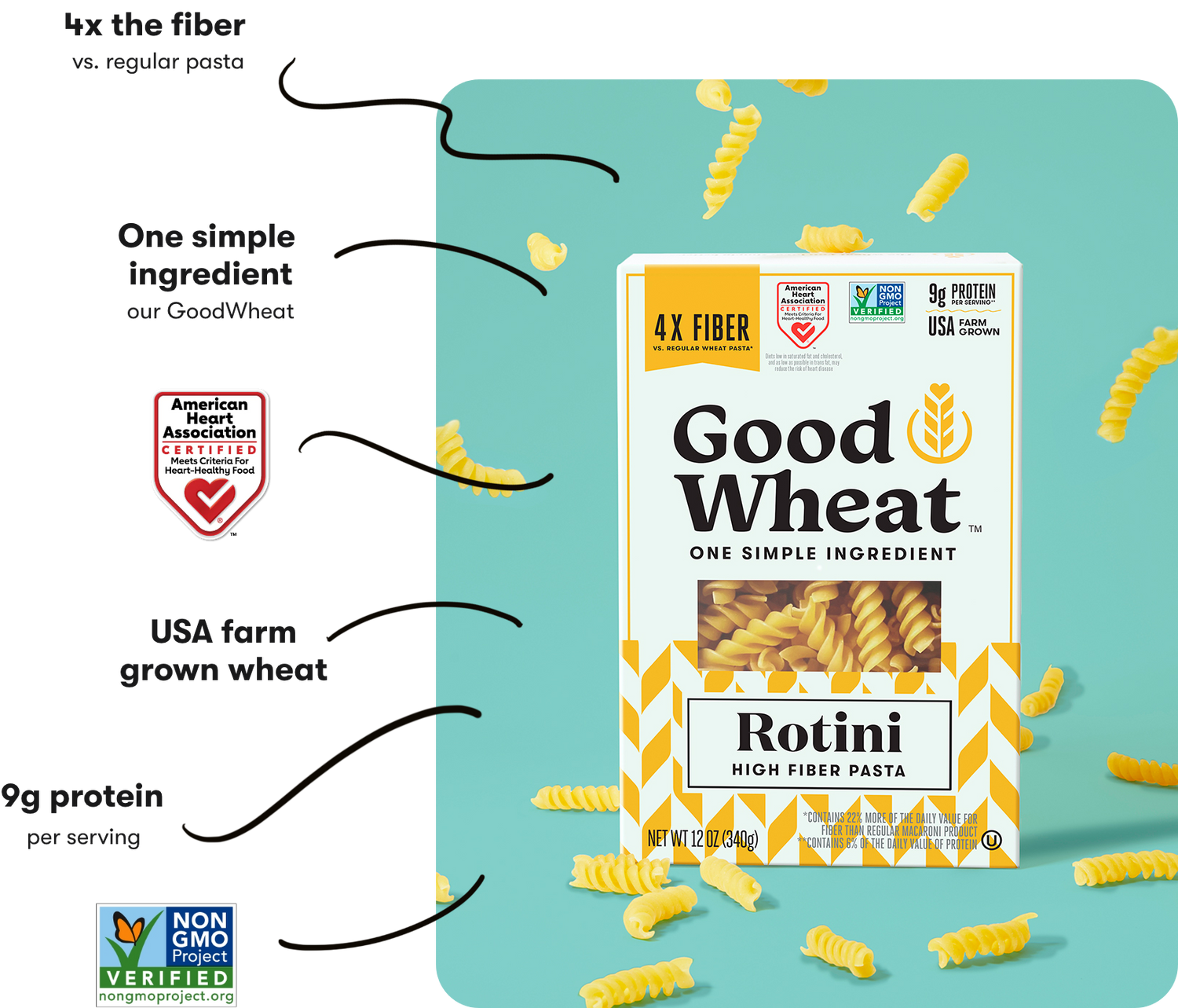 Made by pasta lovers for pasta lovers, GoodWheat tastes amazing, AND it’s better for you. That’s because our GoodWheat is naturally more nutritious with 4x more fiber than regular pasta, so it fills you up and keeps you going.